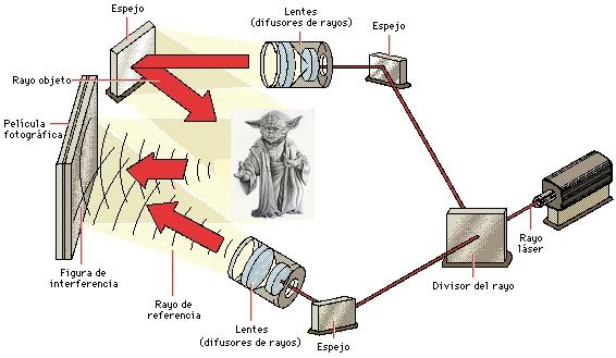 Un holograma es una fotografía tridimensional realizada mediante un rayo láser. La luz de éste se hace llegar a un espejo semirreflectante. El haz que se refleja se envía hacía el objeto y luego es reflejada hacia una placa fotográfica. El otro haz de luz se envía directamente hacia la placa fotográfica donde provocará con el anterior un patrón de interferencia que será holograma. En él estará plegada toda la información del objeto. Cuando se ilumine la placa fotográfica con luz láser la información se desplegará y aparecerá la imagen tridimensional del objeto.