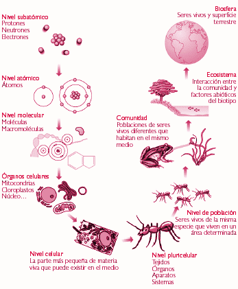 Los niveles de organización son: subatómico, atómico, molecular, celular, pluricelular, población, ecosistema.