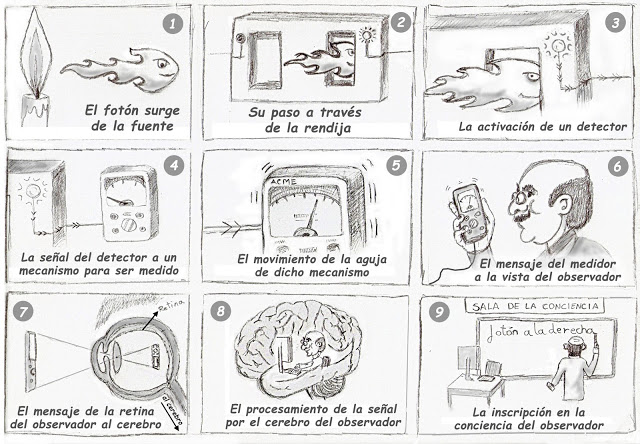 Así pues, podríamos suponer que los animales también podrían colapsar la onda de superposición y materializar la realidad. Aunque también podemos preguntarnos ¿es lo mismo tener consciencia que estar consciente? ¿Puede materializar la onda de probabilidad, mediante la observación, un individuo que no sepa interpretar la información que envía el detector?