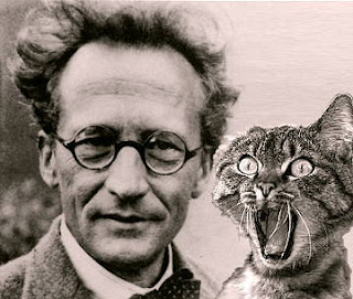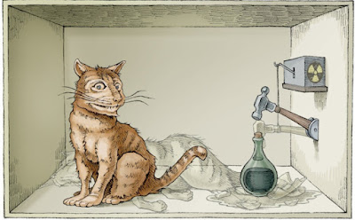 El físico Edwin Schrödinger propuso, en 1935, un experimento mental conocido como “El gato de Schrödinger” (no perder de vista este gato porque está encerrado en más de una entrada) que consistía en meter dentro de una caja opaca a un pobre gato, un aparato con un 50% de posibilidades de emitir una partícula radioactiva y un contador Geiger dispuesto de tal forma que si registraba la emisión de dicha partícula activara un mecanismo donde un martillo rompería una botella de gas venenoso. La cuestión es que el gato tenía un 50% de posibilidades de vivir o morir. Bien, pues para averiguar el resultado del experimento era necesario abrir la caja y observar dentro pero, ¿Qué sucede mientras no se abre?